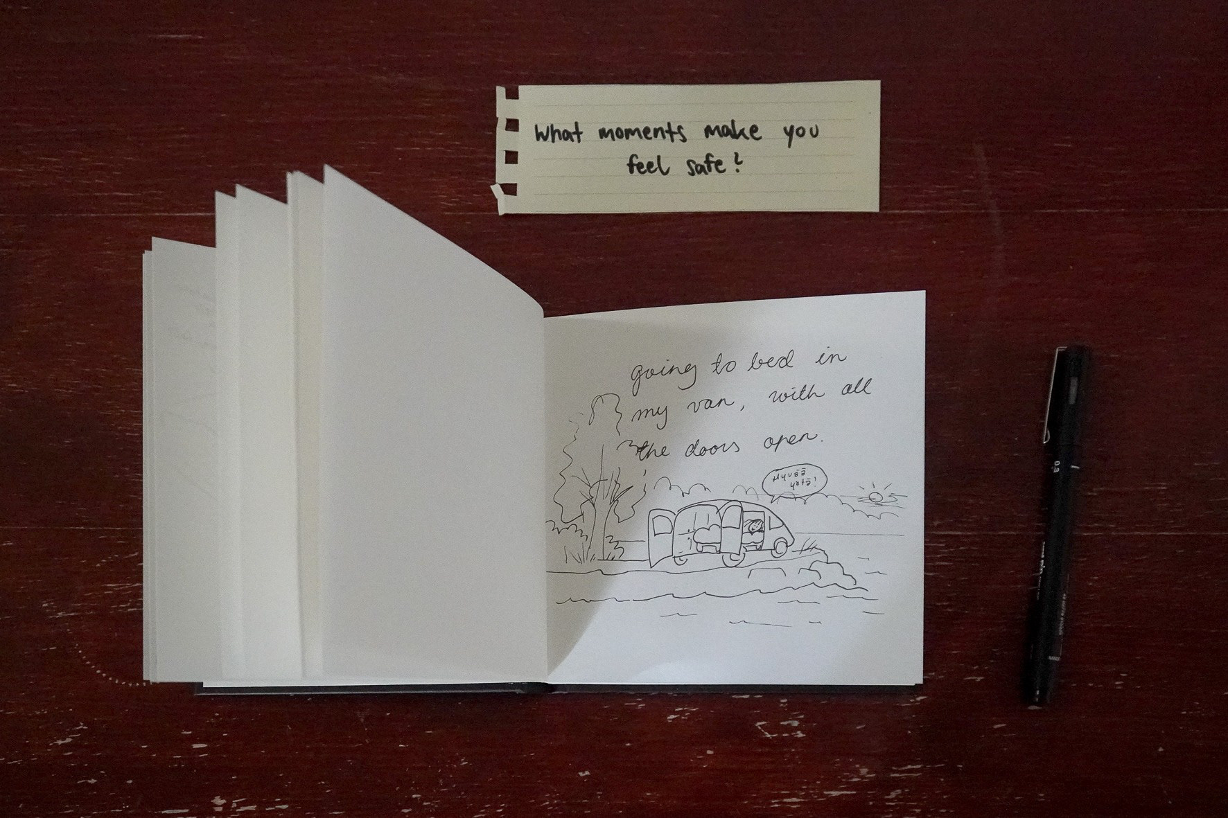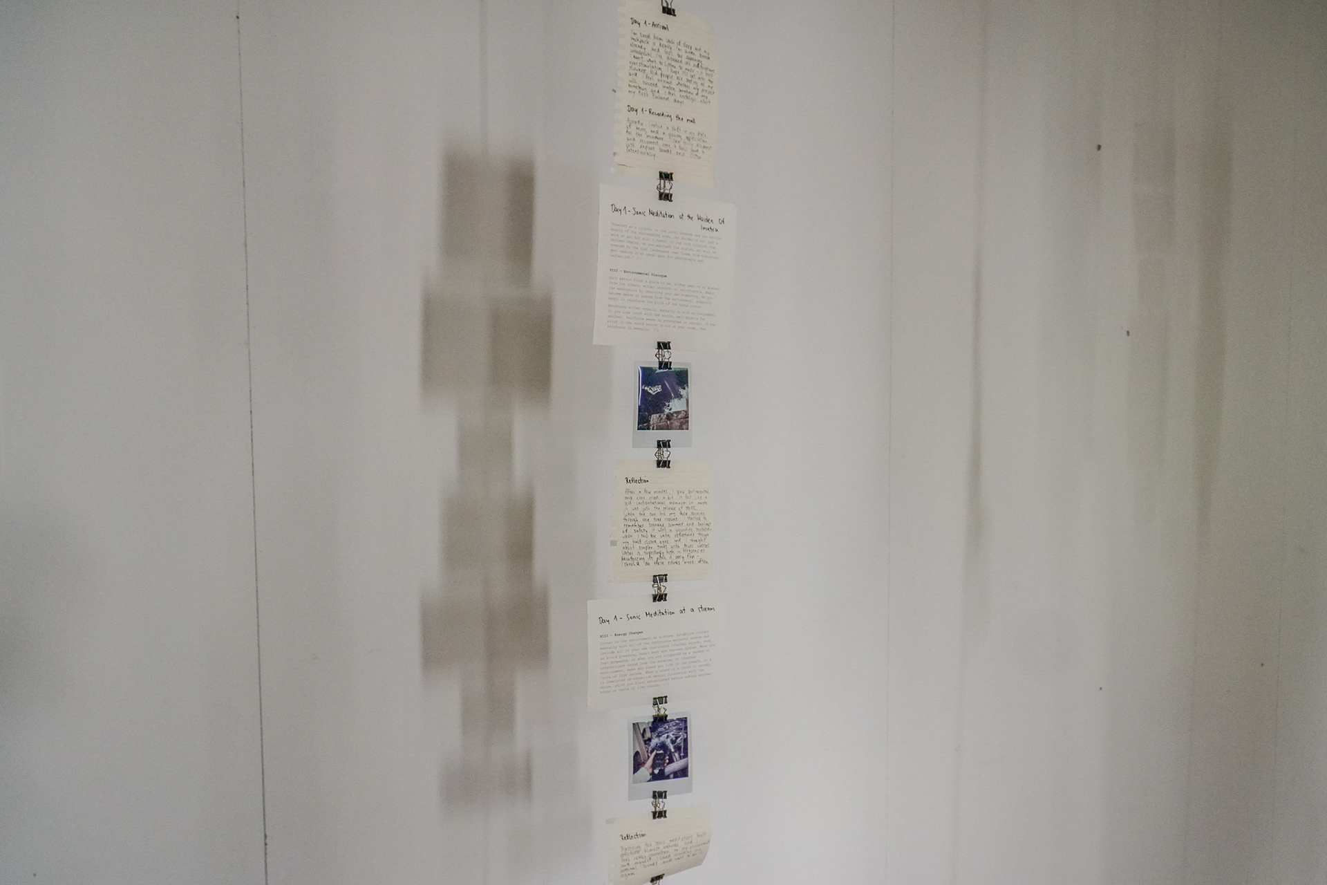 Glimmers is a mixed-media installation which documents personal experiences of glimmers - subtle, calm moments that regulate the nervous system and are known in psychology as the opposite of triggers. In response to a city life where stress is often normalized, the artist embarked on a four-day field trip to the Saimaa region, intentionally disconnecting from overstimulation to invite quiet signals of safety and explore the question: What are glimmers and how can we create space for them?